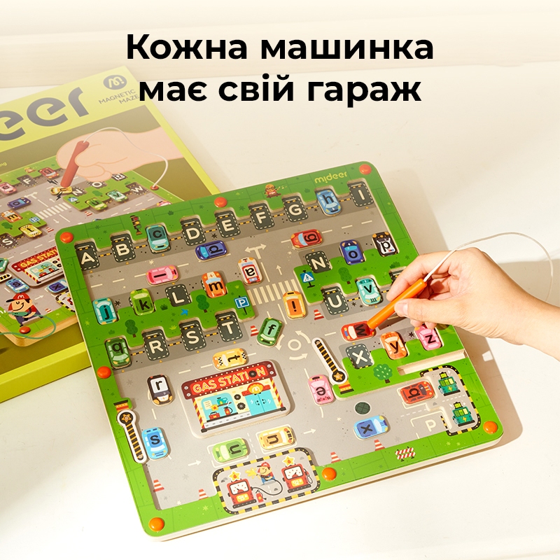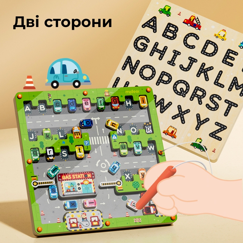 Інтерактивний лабіринт Авто-Паркінг – це інтерактивний лабіринт, який поєднує в собі задоволення від паркування машинок з вивченням алфавіту, що робить його ідеальним вибором як для гри, так і для освітніх заходів. Діти проходять через лабіринт з маленькими магнітними машинками, поєднуючи машинки з малими літерами з місцями для паркування з великими літерами. Лабіринт можна перевертати, щоб покращити розпізнавання та пам'ять алфавіту, а також покращити координацію рук і очей та дрібну моторику.