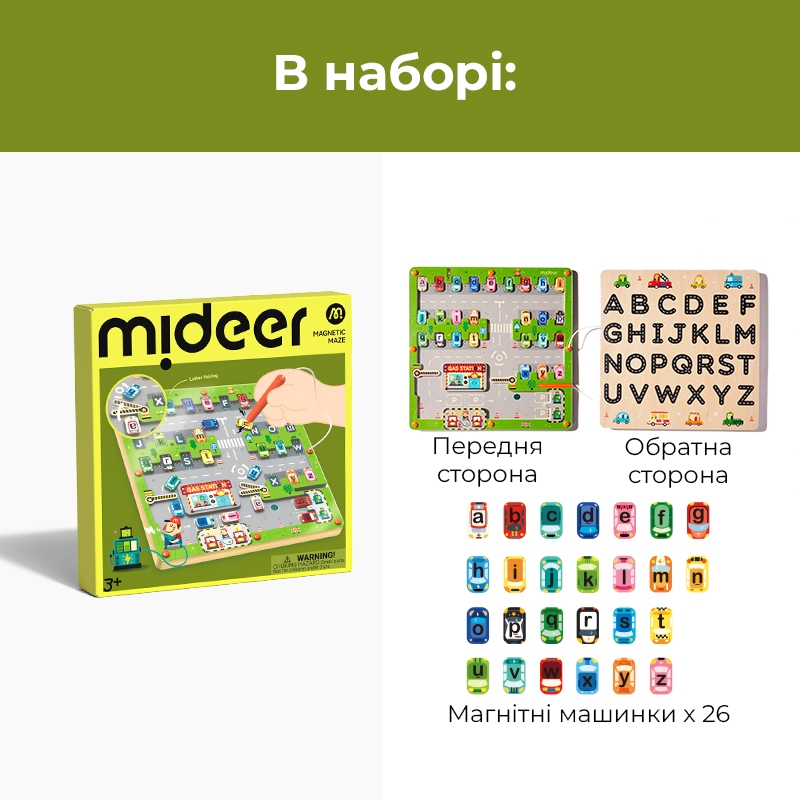 В наборі: ігрове поле, 26 машинок з алфавітом, магнітна ручка.
