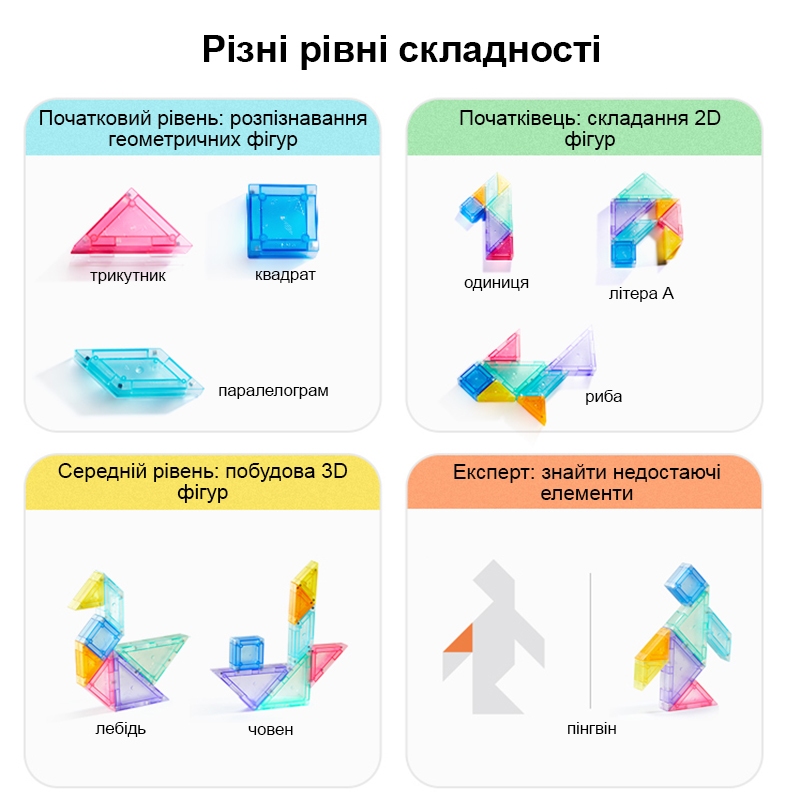 Танграм — це головоломка, що складається із 7 об'ємних фігур, які збирають магнітним чином для отримання іншої, складнішої, фігури.