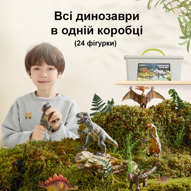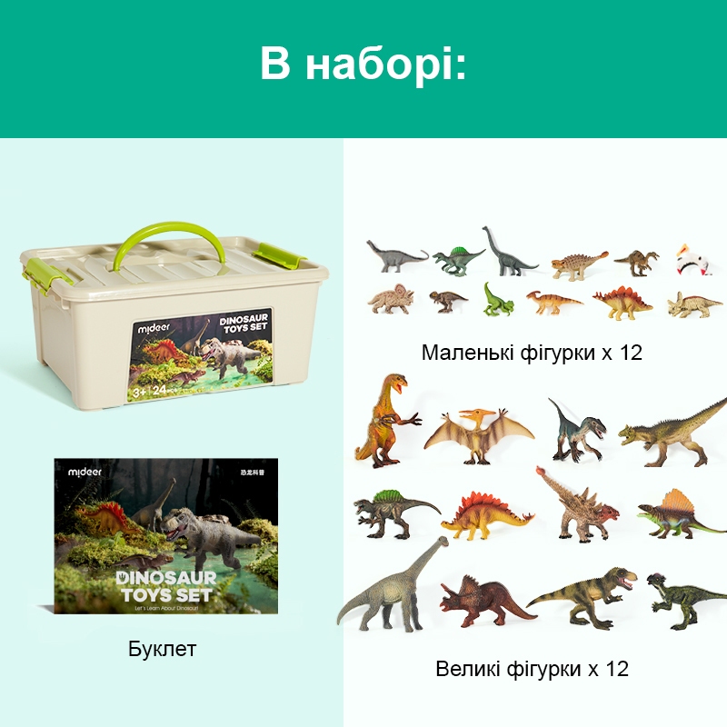 У комплекті — 24 реалістичних динозаврів, велика ігрова карта, книжка з фактами, наклейки та зручна коробка для зберігання.